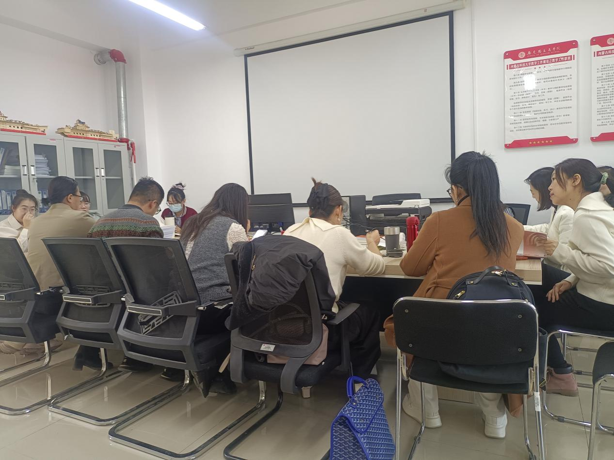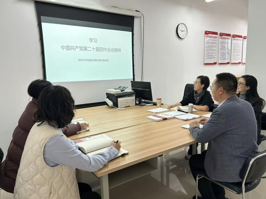 铸牢中华民族共同体意识教研室围绕如何将党的二十届四中全会精神融入铸牢中华民族共同体意识课程这一主题进行集体备课。与会教师们依次分享了各自的教学设计和所选取的案例。大家一致认为:在授课的过程中,不仅要在内容上进行融合,也要在思想上进行融合。教师们表示,将以此次备课会为契机,进一步深入学习党的二十届四中全会精神,完善教学设计,创新教学方法,将全会精神与课程教学紧密结合。