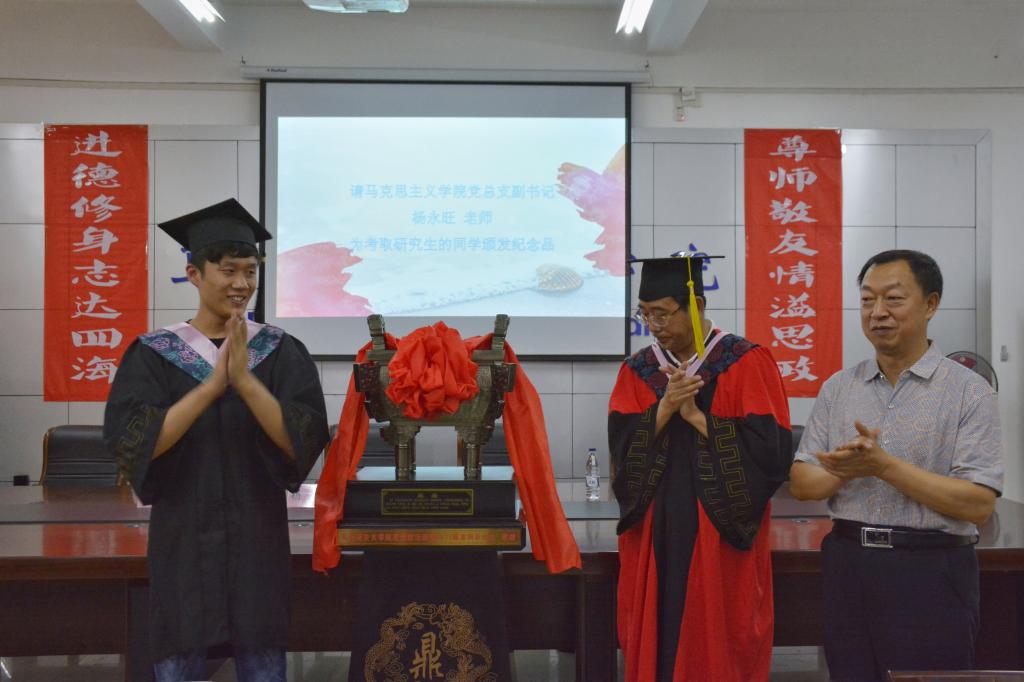 毕业典礼在雄壮的国歌声中拉开序幕,教授委员会委员、教师代表、毕业生代表、在校生代表分别进行了发言。发言结束后行拨穗礼,学院雎密太教授为毕业生拨冠正穗。同时,学院副书记为考取研究生的同学颁发纪念品,希望他们不忘初心,继续前进。接下来的宣誓环节由毕业生代表胡彦琪同学作为领誓人,带领全体毕业生庄严宣誓。最后毕业生向学院赠送礼物,大家合影留念,毕业典礼圆满落下帷幕。