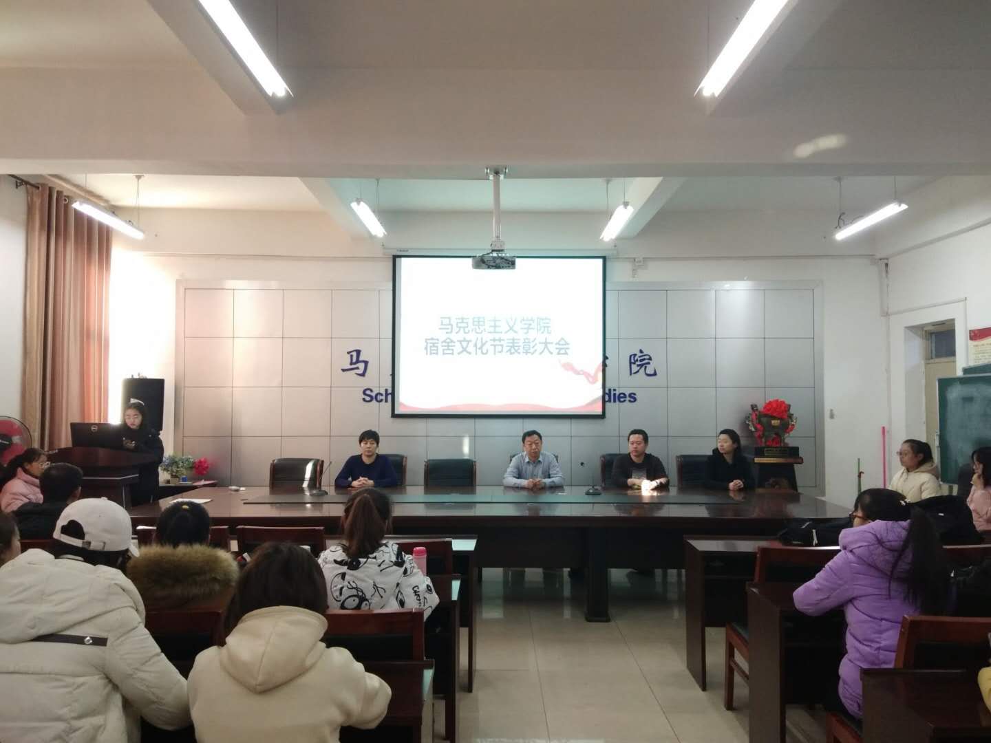 12月11日上午9:30,大象传媒 在腾飞楼C517举办本学期“宿舍文化节”表彰大会,学院党总支副书记、学工办老师,及优秀宿舍代表、优秀个人代表等40余名学生参加了此次会议。