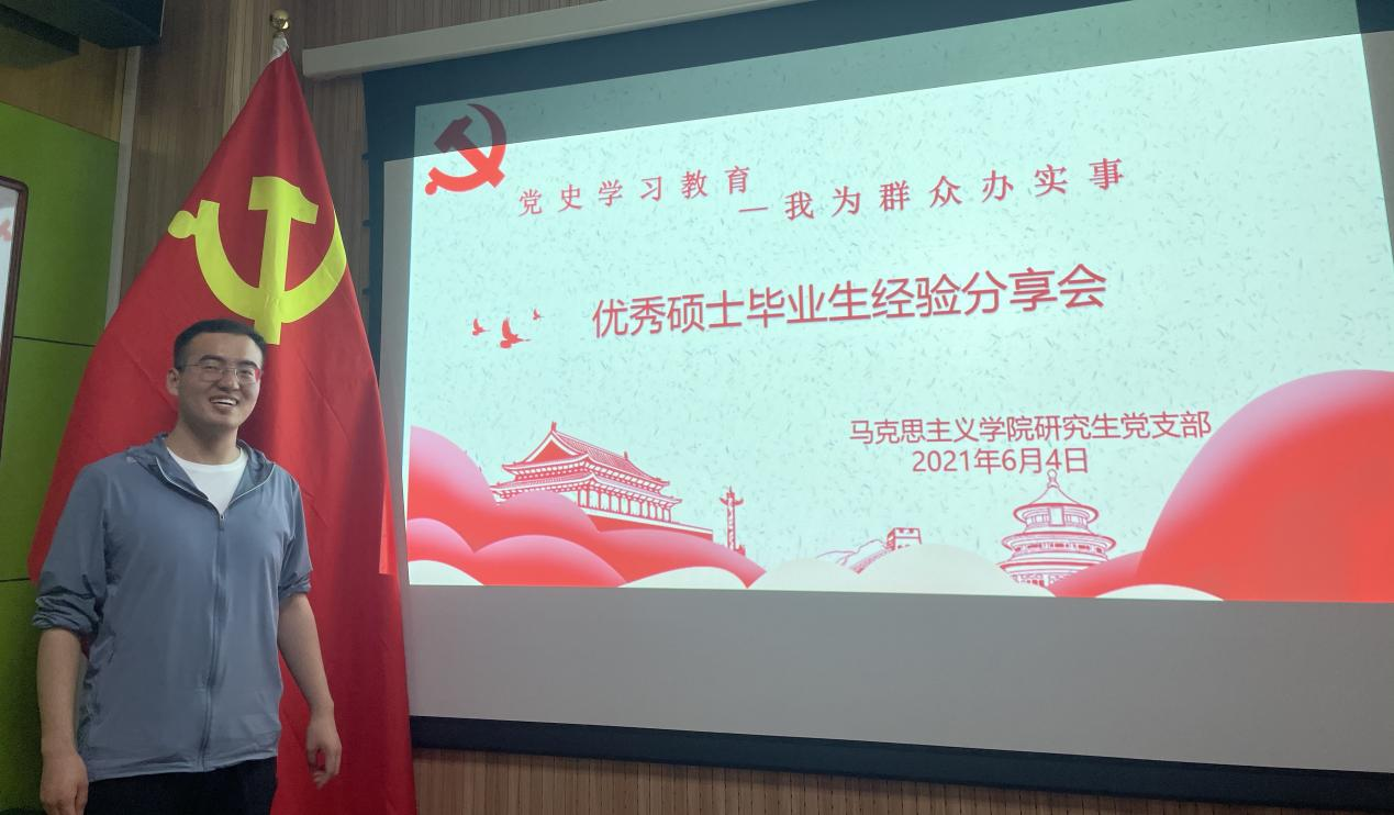 研究生党支部组织开展了优秀硕士毕业生经验分享会,由成功考取选调生的党员代表郭存在同学分享个人公务员考试的经验体会,帮助研一、研二学生进行职业生涯规划和就业指导。