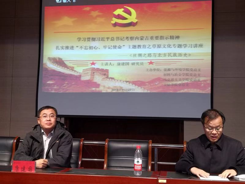 党总支和能源与环境学院、材料与冶金学院、文法学院等党总支联合在在图书馆B201报告厅举办“不忘初心、牢记使命”主题教育之草原文化专题学习讲座。邀请内蒙古社科院草原文化研究所研究员康建国作了题为《丝绸之路与北方民族历史》的专题讲座。学院党总支书记刘玉明,教工党员代表、研究生党支部及本科生党支部全体党员参加学习活动。